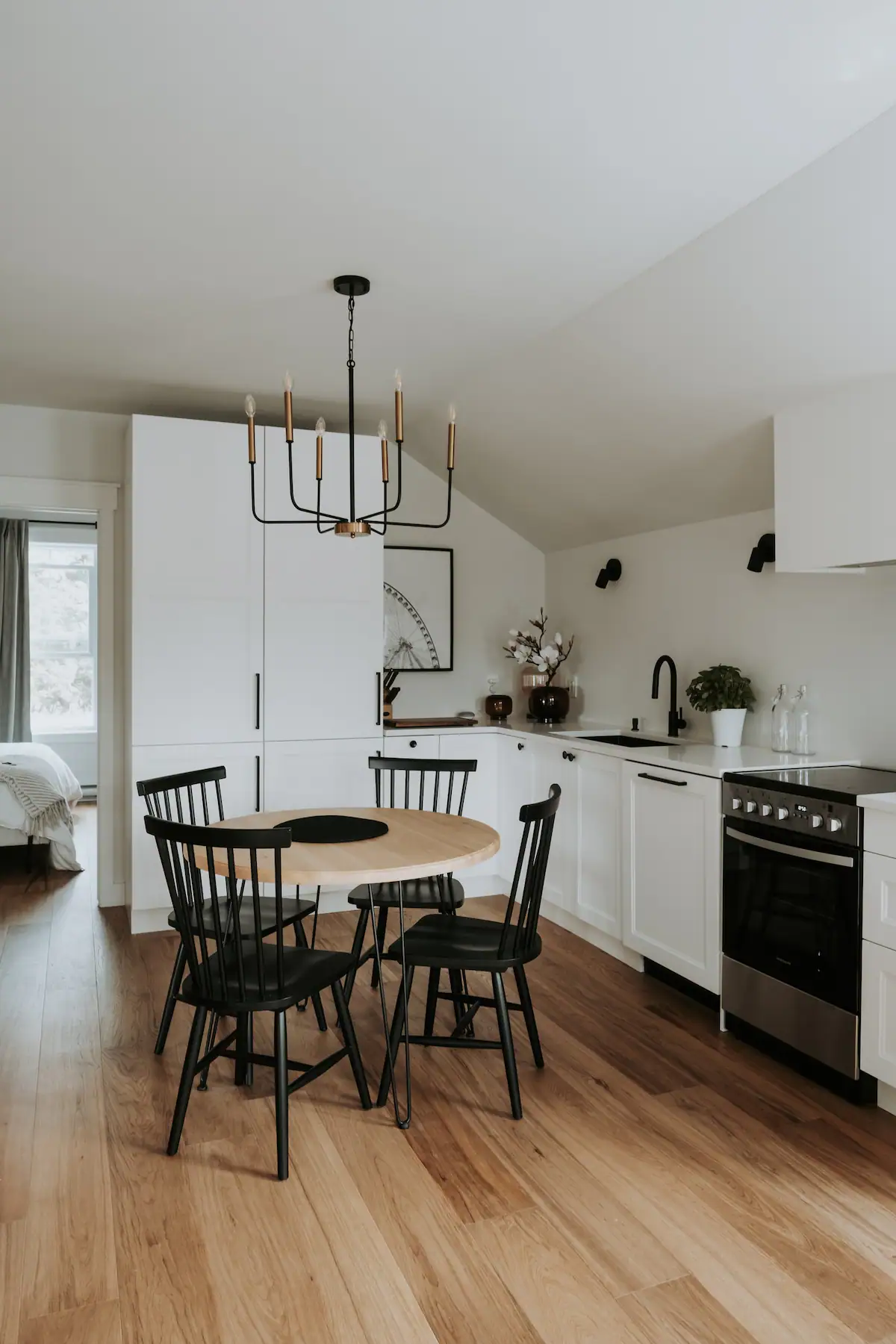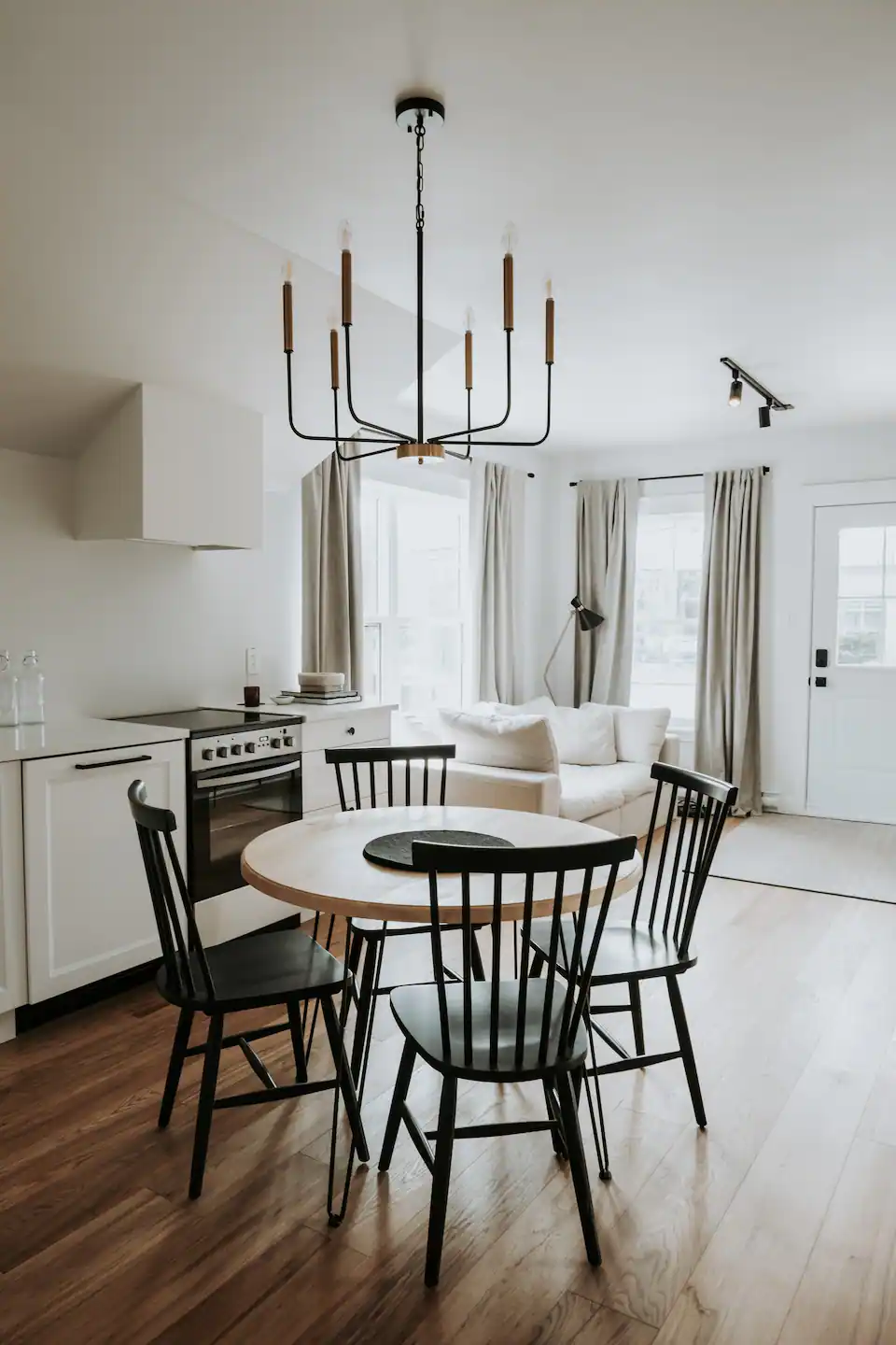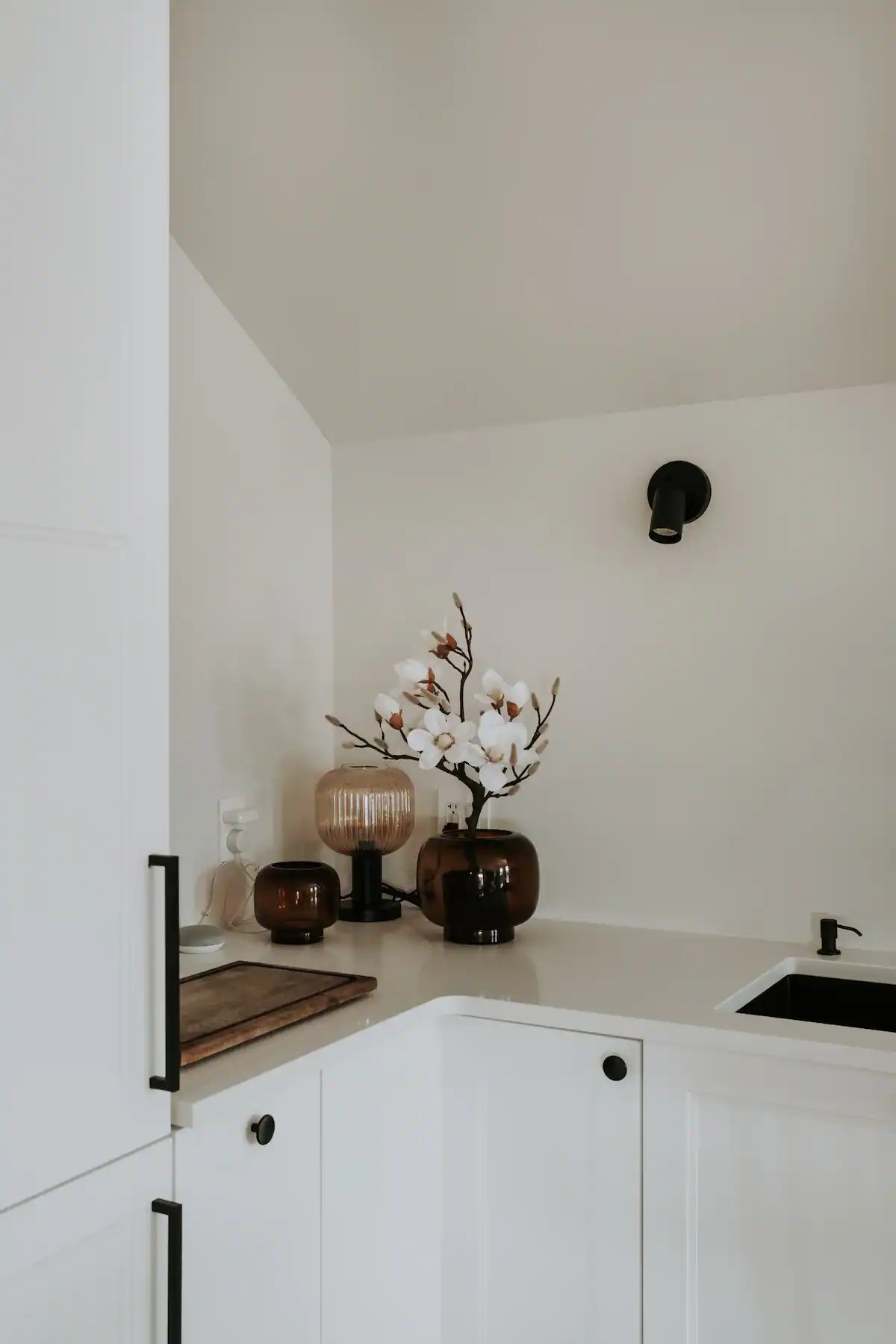L’objectif était de créer une atmosphère à la fois accueillante, confortable et élégante. Le lustre, élément central de la pièce, apporte équilibre et caractère tout en renforçant le style et la sophistication de l’espace. La décoration minimaliste est chaleureuse grâce à un mobilier alliant lignes épurées et formes classiques, complété par des accessoires comme des coussins en lin, des couvertures en laine, des tapis en jute et des œuvres d’art mêlant éléments naturels et touches modernes. Les matériaux contemporains, tels que les finitions en métal noir et les surfaces en quartz, sont soigneusement équilibrés pour créer une harmonie visuelle.